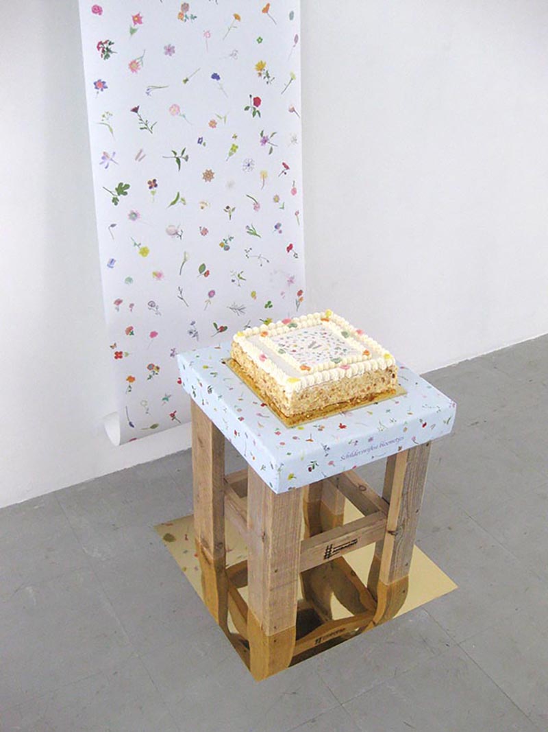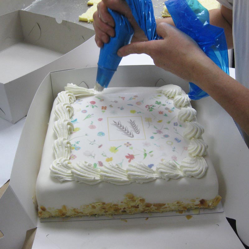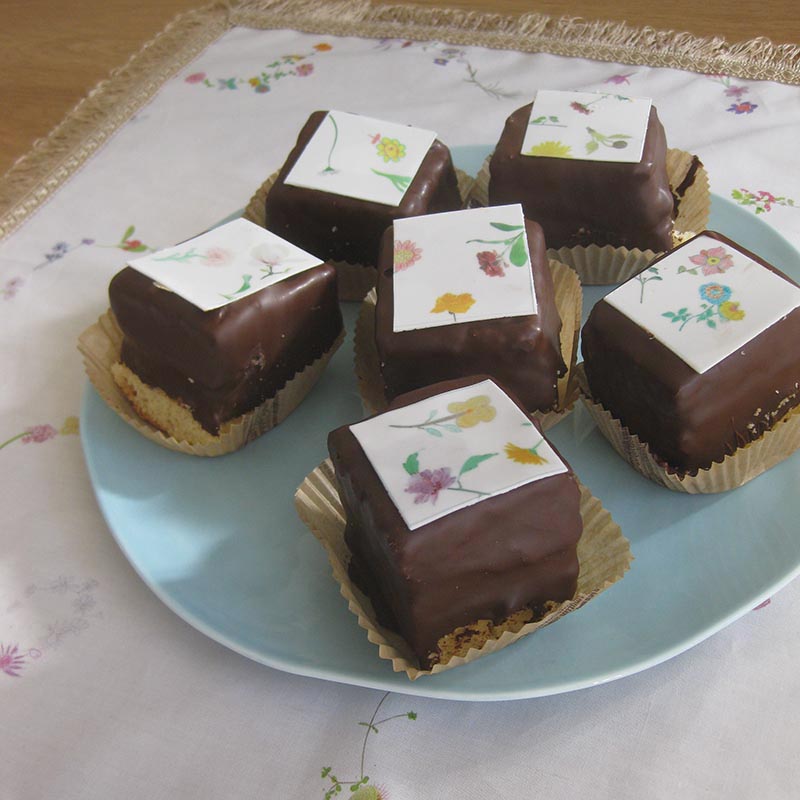 Gebakjes en taart met de bloemetjes erop, gemaakt bij de