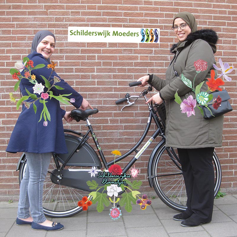 Samira (buurthuis De Mussen) en Amal (Schilderswijk Moeders) met de eerste Schilderswijk Moeders-fiets, die beplakt is met hun eigen logo en Schilderswijkse bloemetjes.