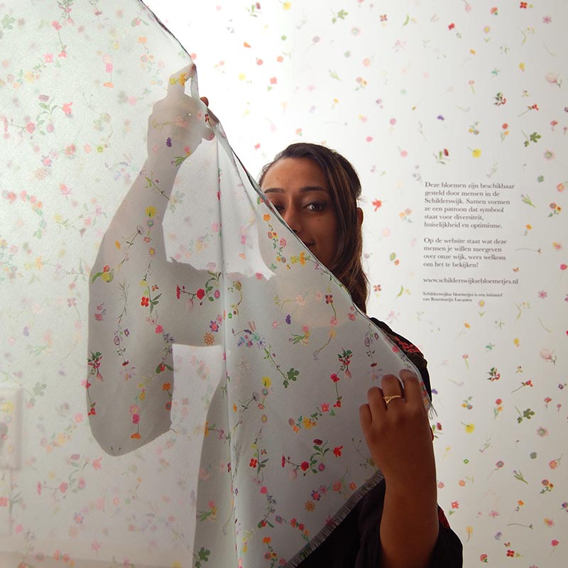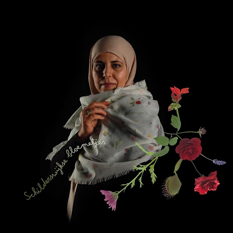 Een sjaal met Schilderswijkse bloemetjes erop, tijdens de fotosessie in theater De Vaillant op Internationale Vrouwendag. Klik hier om de fotoserie op Facebook te bekijken.