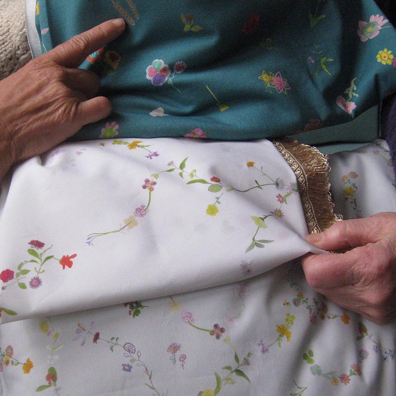 Sjaal met Schilderswijkse bloemetjes erop, geshowd door Haseena in buurthuis De Mussen. Klik hier om de fotoserie op Facebook te bekijken.