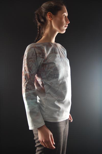 De pluisfoto hier onder heb ik op stof laten drukken en daar een trui van gemaakt. Zo draag ik eigenlijk een stukje persoonlijke ruimte van iemand anders; van een Canadese kunstenares om precies te zijn.