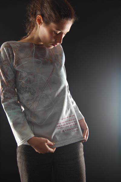 With this sweater I tried to make a less complex image, that might caught the attention more easy and focus more on the text. If people want to read the sentence they have to get close to me and the 'sharing of space' occurs in a subtile way.