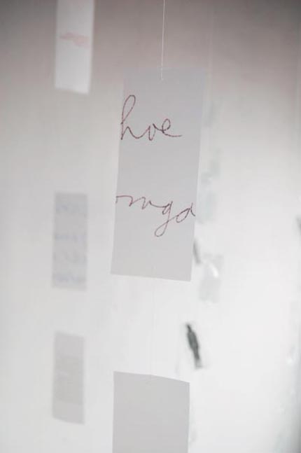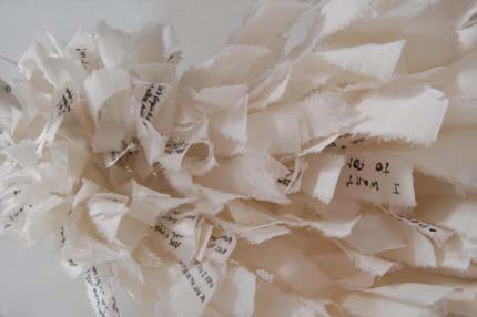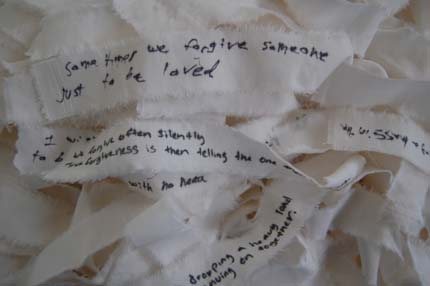 At the start: Feathernotes-sentences on strokes of fabric about forgiveness.