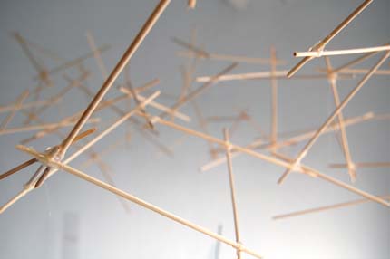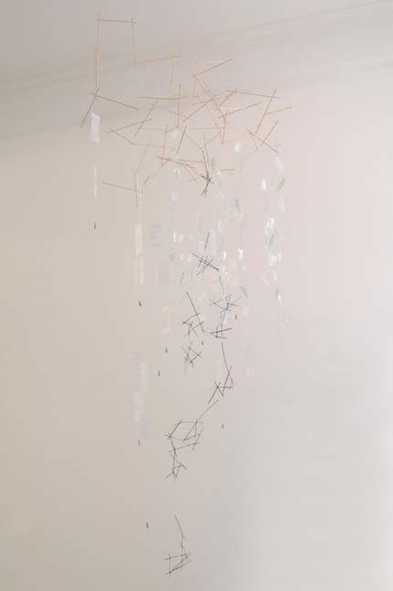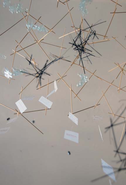 Aan een open constructie van sateestokjes hangen kaartjes, met daarop de handschriftfragmenten en de vragen en antwoorden van mensen die ik heb gesproken voor Feathernotes.