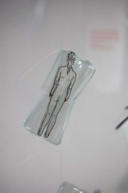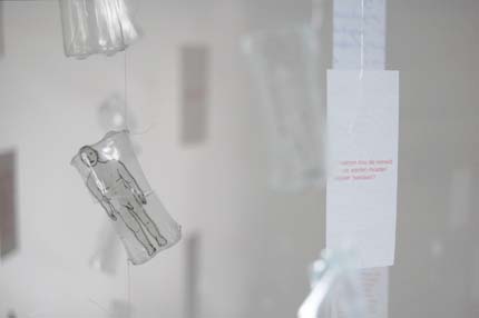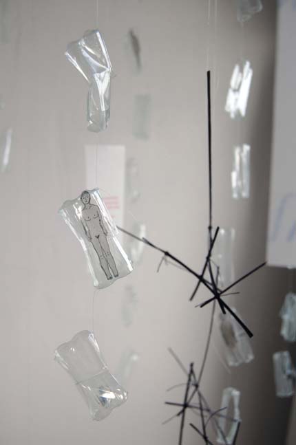 In the mobile there are also strings hanging with small trantsparant human-units (made out of wrappings of batteries). To me this illustrates that every human has his own emotionalspace, which allows information exchange, but stays very limited if one doesn't work on it actively.