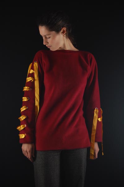 At the inside of the sweater I wrote parts of the Feathernotes-conversations by hand: at the torso-part in pure speakinglanguage (with hmm's, you know's etc.), about personal experiences with early clothes that stayed in people's memory. At the sleeves (in more edited sentences) peoples visions on sharing space. (See the 'quotes' link for the texts.)