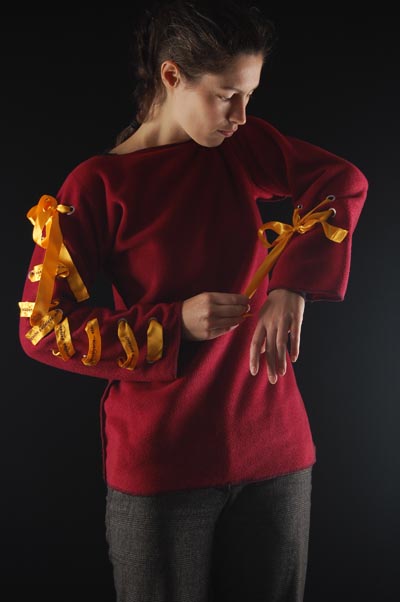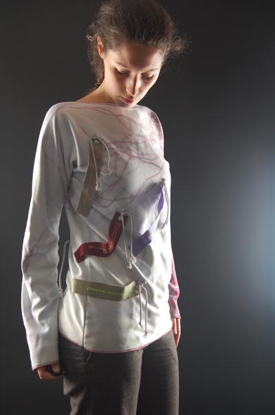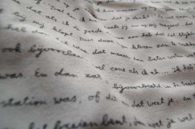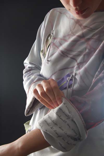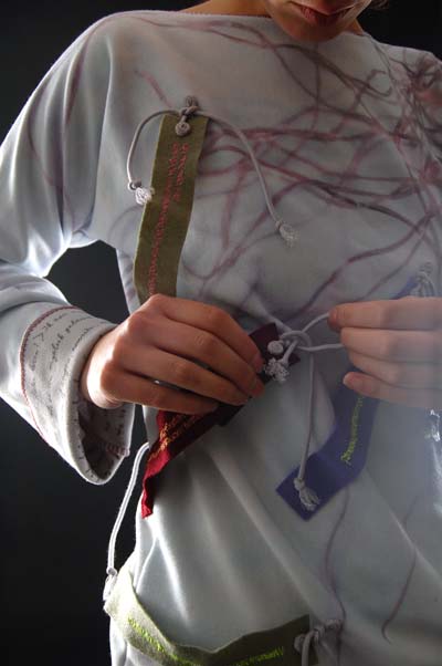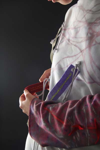 The questions are embroidered on the inside of strokes of vilt, wich can be tied open to make the text readable to others. On the inside of the sweater there are more extensive texts written; so the sweater can be worn at two sides.