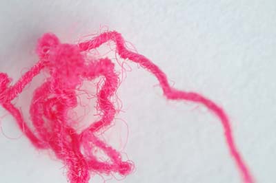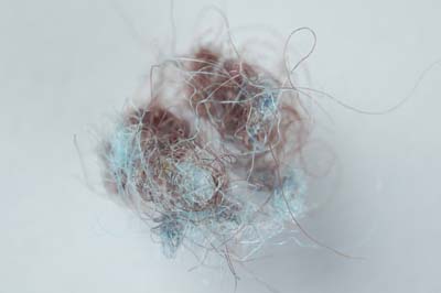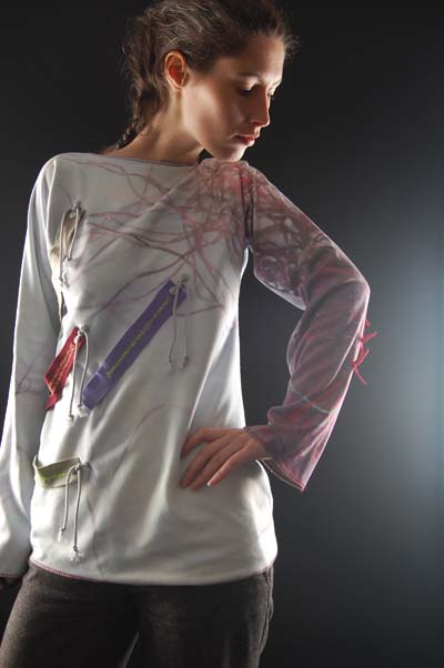 Het pluisje hier onder komt van een gebarentolk. De trui die er uit is ontstaan bevat vragen van meerdere mensen, en vraagt enige handelingen van de drager (zie filmpje).
