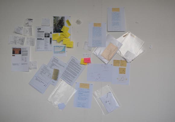 On an open construction of wooden sticks there are cards hanging with fragments of handwriting and the questions and answers by people that I have spoken with.