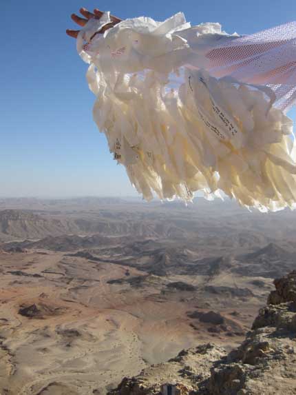 At the Ein Gedi desert in Israel. The scarf seemed to become a beautiful object; maybe I'll finish it later on during this research. When I was busy with it, it disappointed me that the subject 'forgiveness' appeared to be so loaded for people. I aspected a certain spontaniousness in the reactions, but received a lot of statements that showed a global wisdom, and less that contained personal openness. But for sure there where sentences written that brought original views on the theme forgiveness; great! Later on I concluded that a statement about an ethical issue isn't easy at all, and that it comes with a complete discussion, with substantive sidecomments for creative oxygen. See the 'quotes' link for the sentences that people wrote (in English).