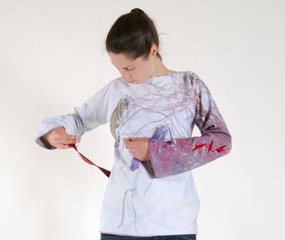 De vragen zijn geborduurd op de binnenzijde van stroken vilt, die opengeknoopt kunnen worden om de tekst leesbaar te maken voor anderen. Op de binnenkant van de trui staan meer uitgebreide teksten geschreven; de trui is dus aan twee kanten draagbaar.